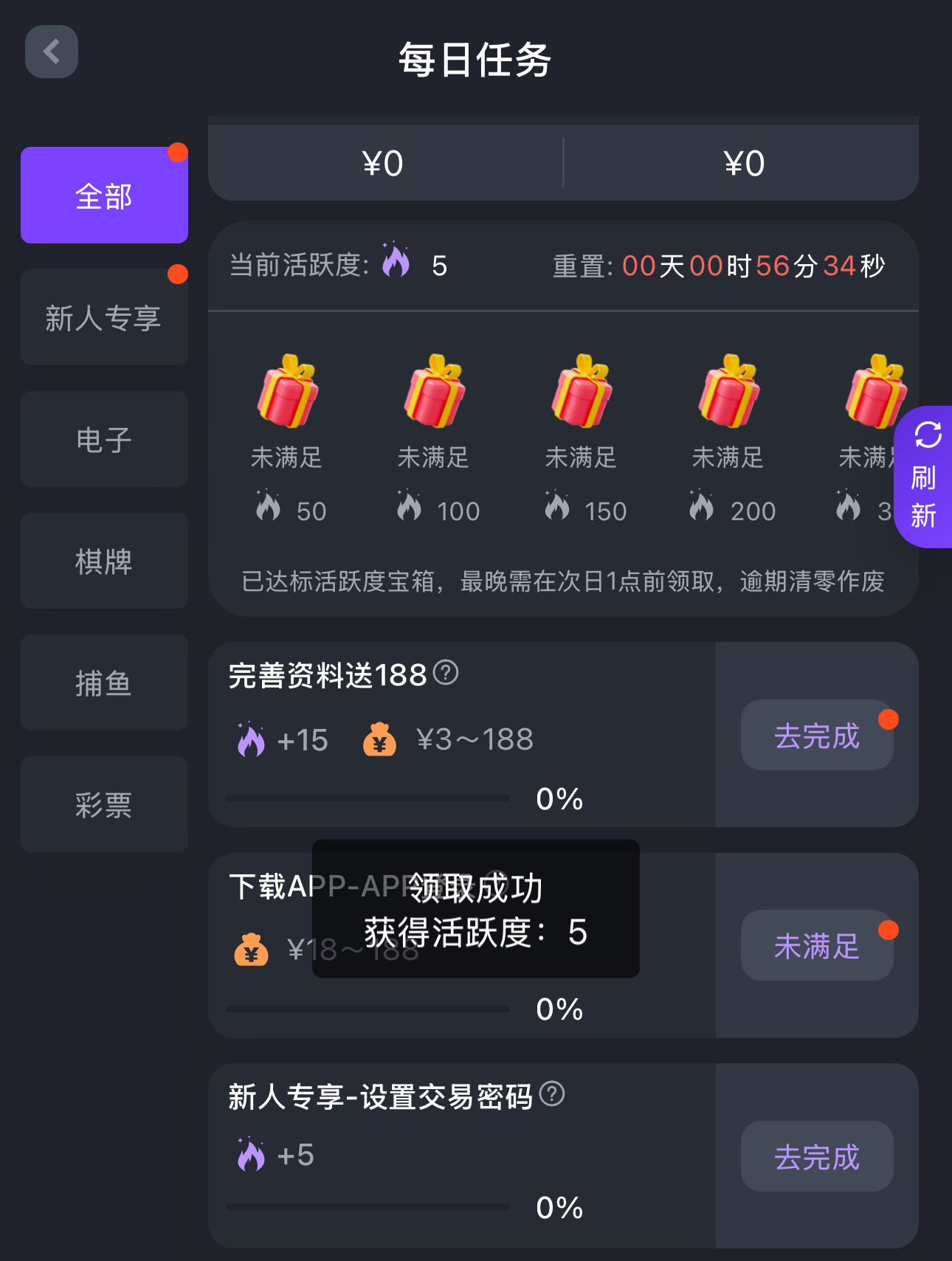 新用户注册绑卡完善所有资料,点击优惠-每日任务里面自助领取