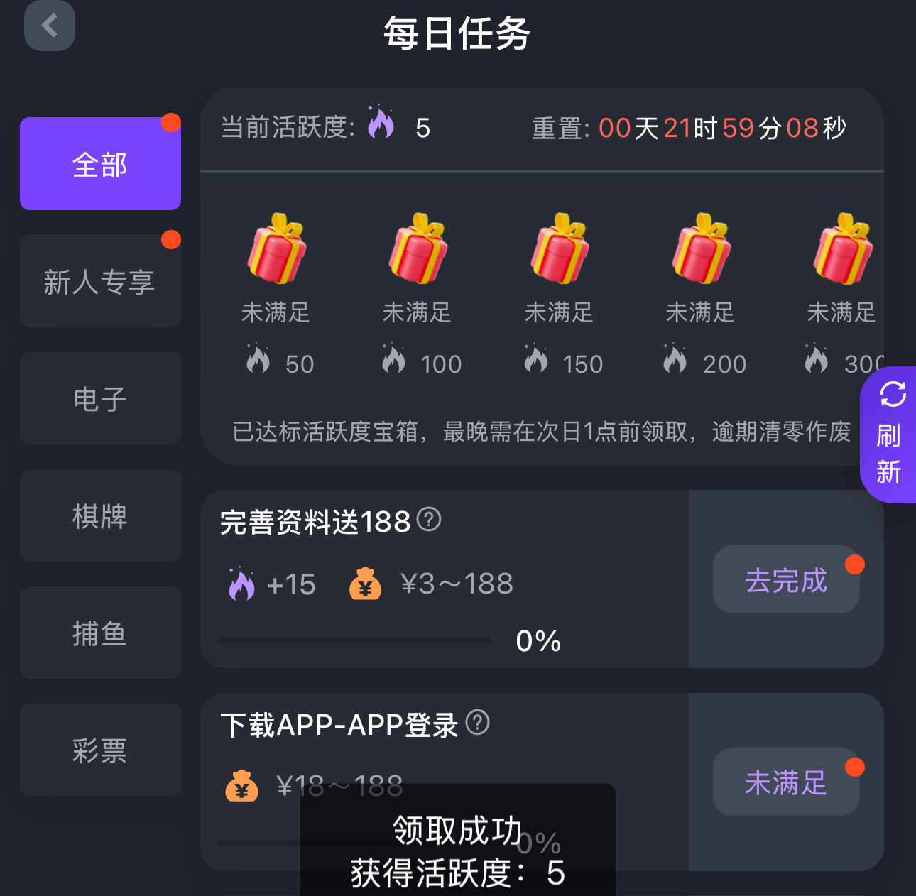 注册绑卡完善所有资料,点击优惠-每日任务里面自助领取