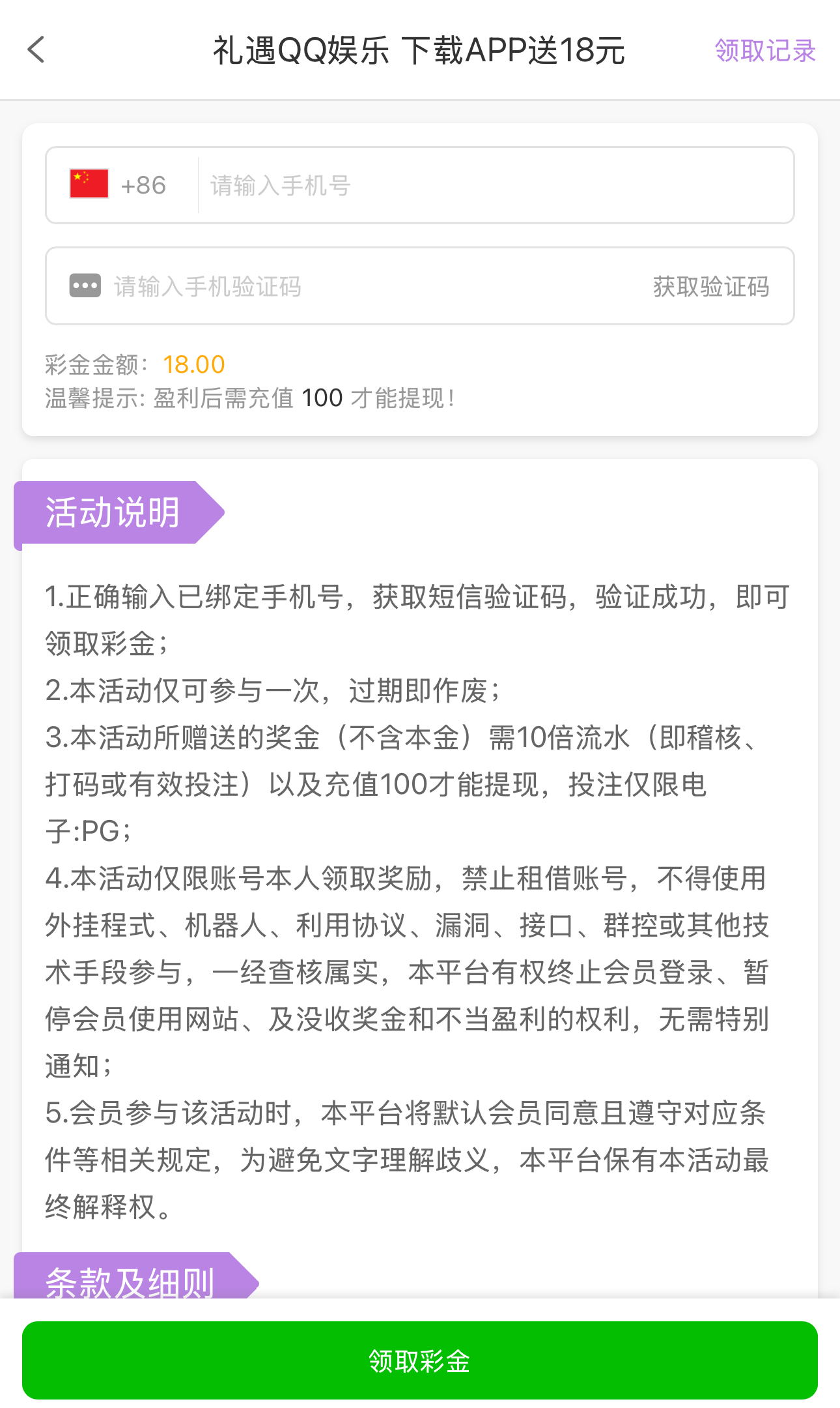 正确输入已绑定手机号,获取短信验证码,验证成功,即可领取白菜