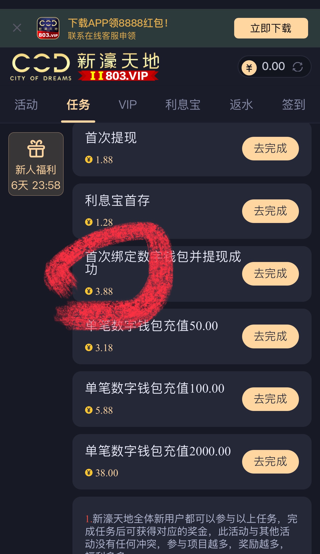 新用户注册绑卡点击优惠大厅里的任务,绑定数字钱包送体验金3.88,可以试一下