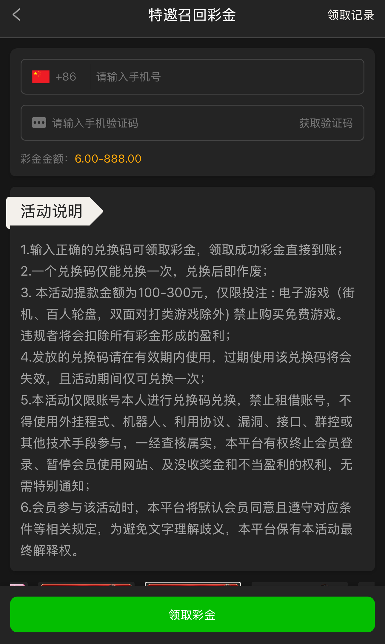 碰瓷特邀召回彩金,老用户有账号的去登录优惠大厅页面自助填写手机号碰瓷召回彩金